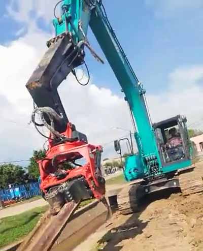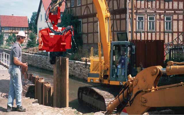 Para instalación rápida, eficiente y segura disponemos de un moderno Vibrohincador hidráulico montado sobre excavadora de 21,3 toneladas. Dicho dispositivo cuenta con cabezal giratorio y mordaza basculante que toma las tablestacas directamente de la estiba sin necesidad de ningún equipo auxiliar. Esto reduce costos y tiempos de instalación.